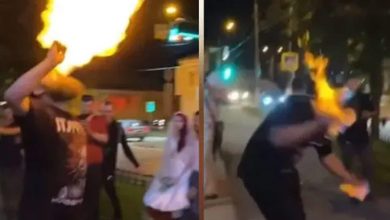 اجراکننده در حال اجرای نمایش آتش بازی در خیابان بود که ناگهان سر وی غرق شعله های آتش شد.