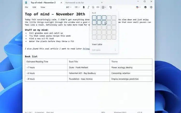 مایکروسافت در حال افزودن قابلیتی جدید و کاربردی به برنامه محبوب Notepad در ویندوز ۱۱ است: پشتیبانی از جدول‌ها.